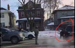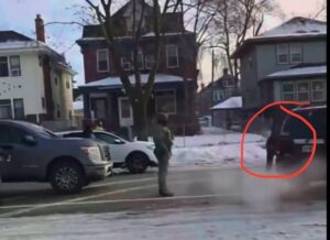 The footage appears to show the vehicle striking one agent, causing the agent to spin, before continuing toward a second agent positioned nearby. As the car advances, the second agent opens fire. The sequence unfolds rapidly, leaving little time for de-escalation once the vehicle begins moving.